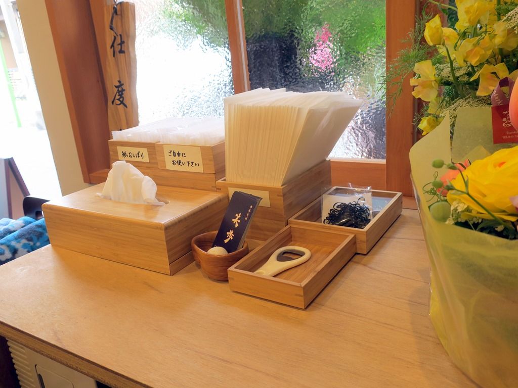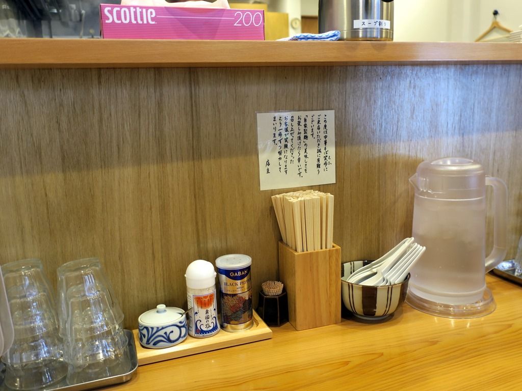 BGMはJ-POP、ボリューム低いけど多分椎名林檎。箸は割り箸。つけそば用の割りスープはカウンター上のポット。卓上調味料は、七味唐辛子、粟国の塩、GABANブラックペッパー。