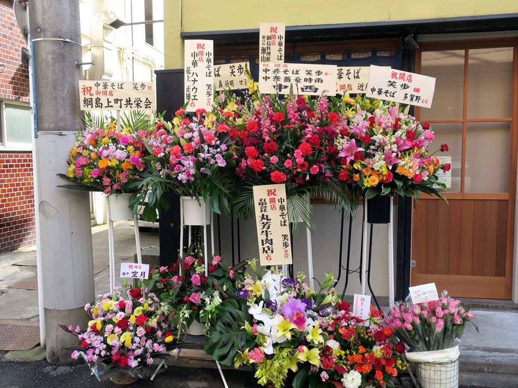 店頭には開店祝花いっぱい。多賀野、中西、中華ハナウエ、とんちぼ、空月からの花が確認出来ました。