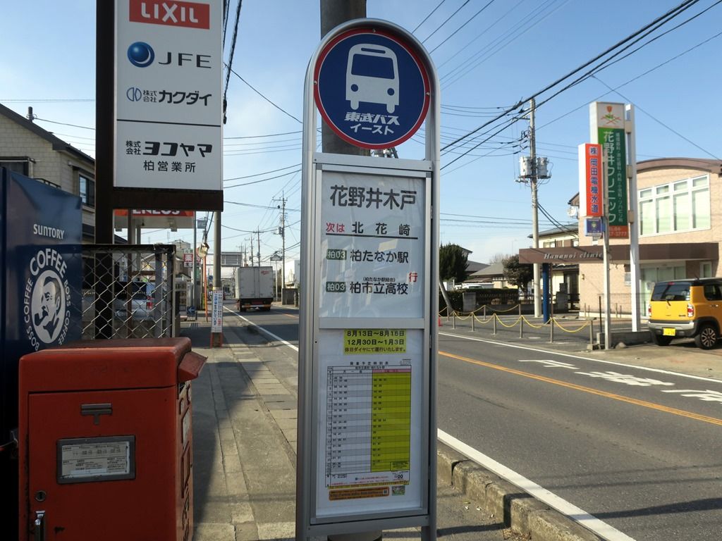 バスルートの場合、徒歩約1分のところに「花野井木戸」バス停があって、柏駅西口から柏14、北柏から柏03、柏の葉キャンパス駅から柏10のルートがあります。。