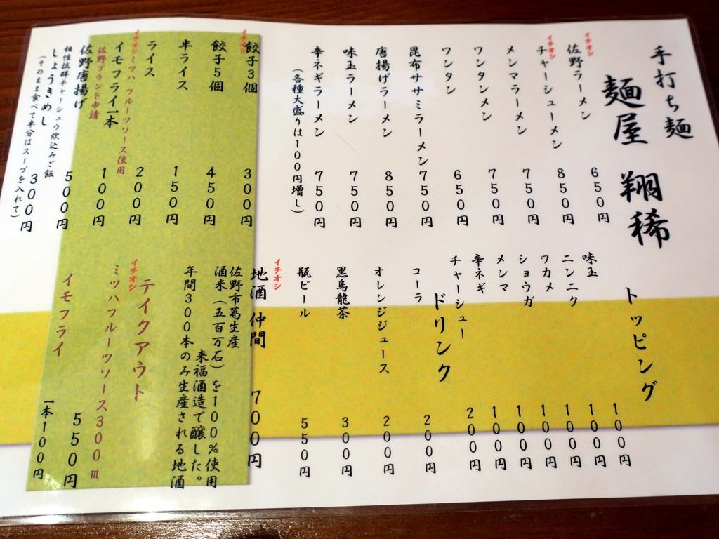 券売機はなく伝票方式後会計制。主なメニューは佐野ラーメン650円、餃子3個300円、イモフライ100円、佐野唐揚げ500円、しょうきめし300円、他。