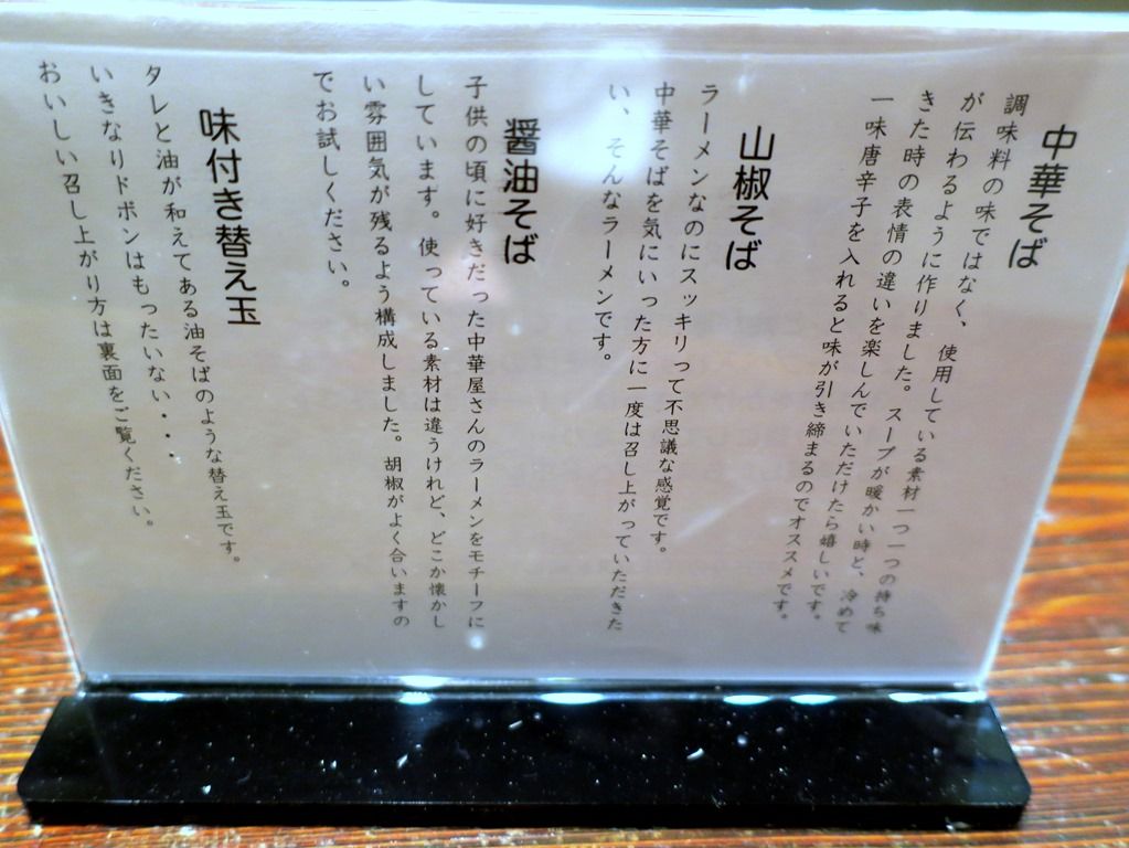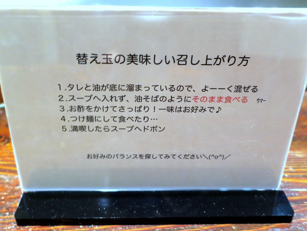 卓上メニュー立てにはメニュー説明。裏は、「替玉の美味しい召し上がり方」。