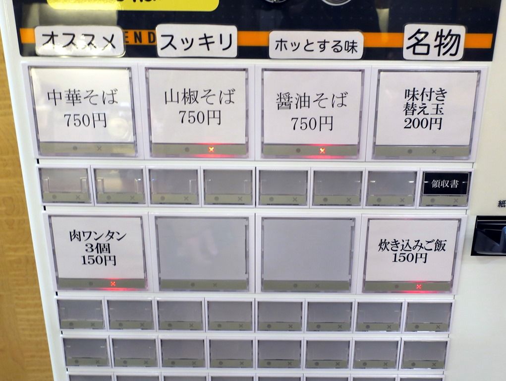 入店するとまず券売機で食券購入です。メニューは、中華そば750円、山椒そば750円、醤油そば750円、名物味付き替え玉200円、肉ワンタン3個150円、炊き込みご飯150円。