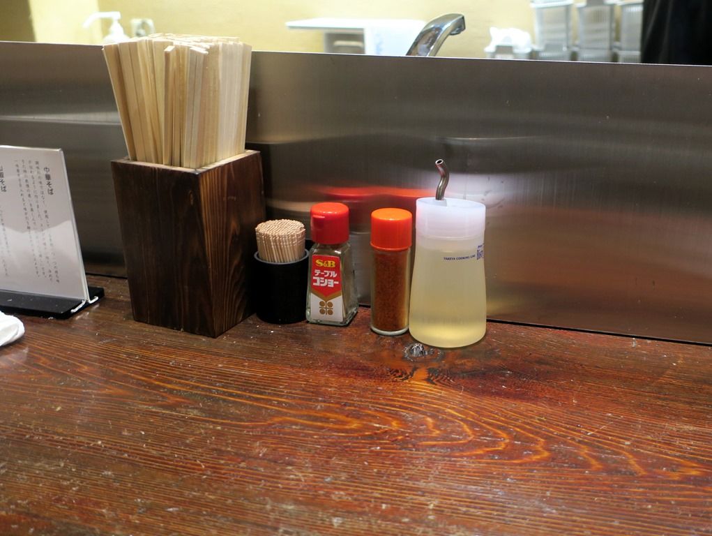 箸は割り箸。卓上調味料はS&Bテーブルコショー、一味唐辛子、酢。メニュー紹介によると、中華そばには一味、醤油そばには胡椒が合うそうです。