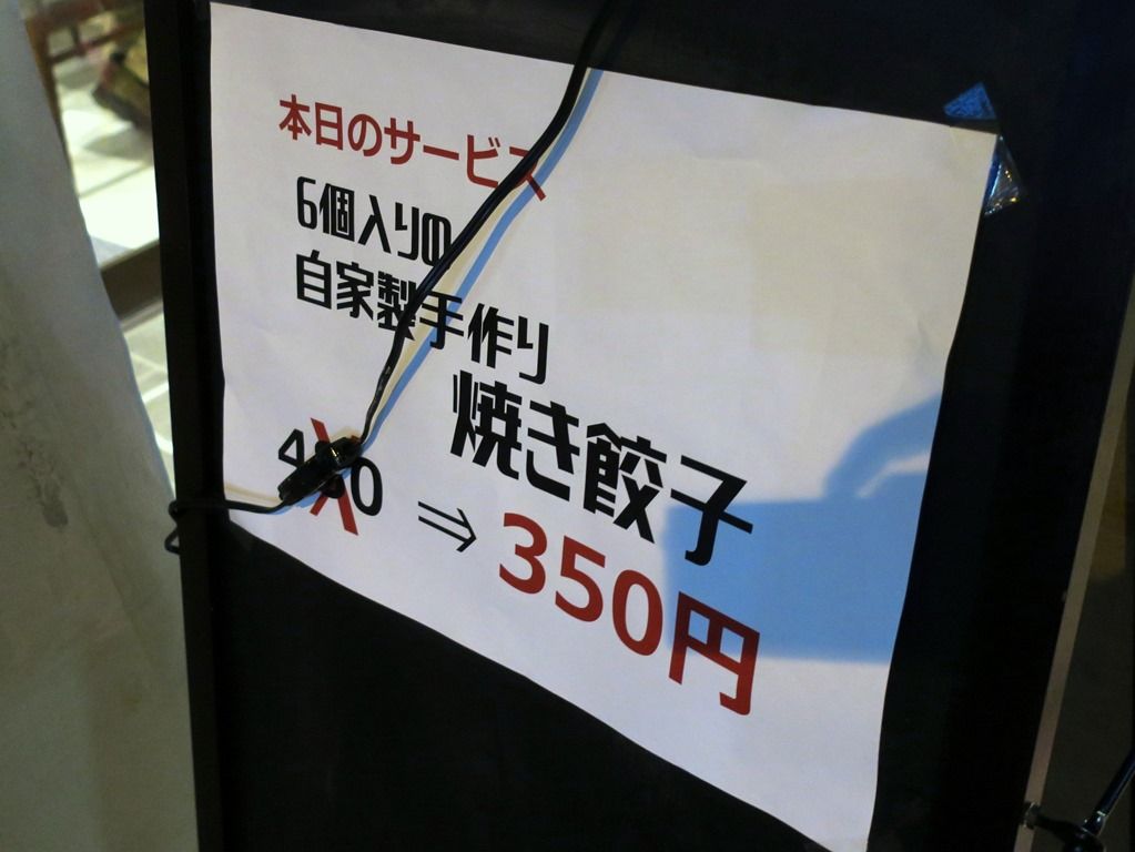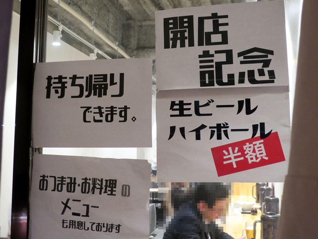 開店記念で、生ビール・ハイボール半額セール中。本日のサービスは焼餃子100円引き。券売機はなく後会計制。