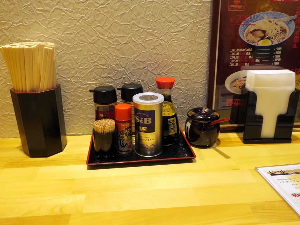 BGMはJ-POP。箸は割り箸。卓上調味料は、醤油、酢、ラー油S&B一味唐辛子・ホワイトペッパー、甜麺醤は何に使うのかな!?