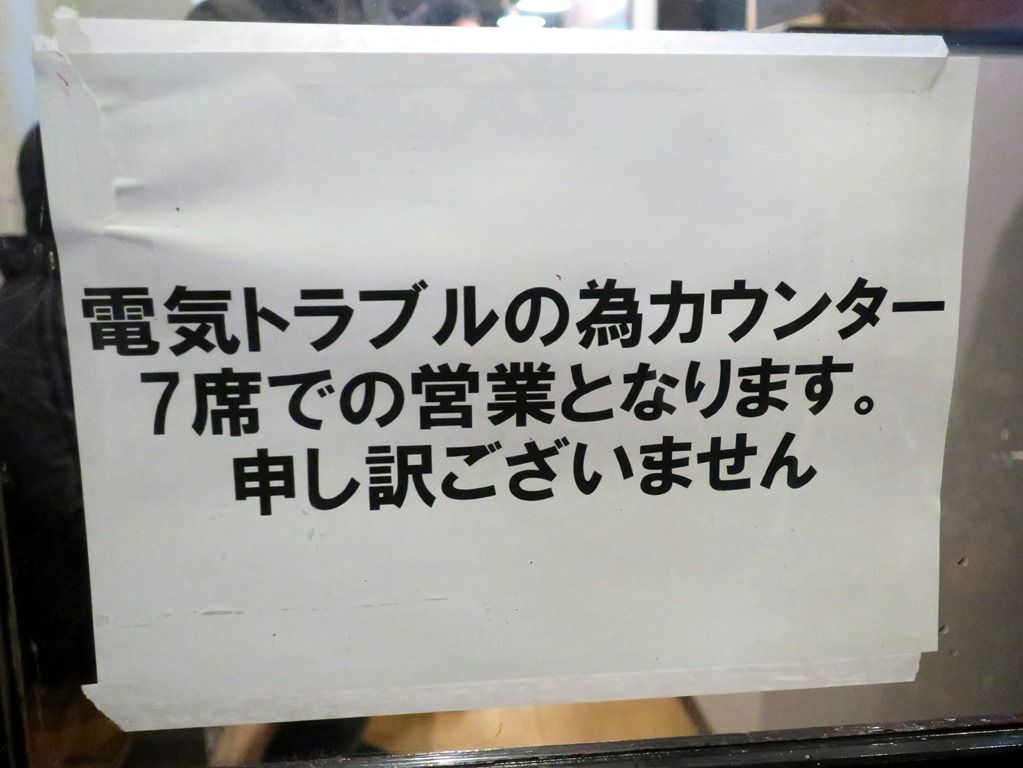 ですが、電気系統のトラブルのためテーブル席側の灯りがつかず、カウンターのみでの営業。