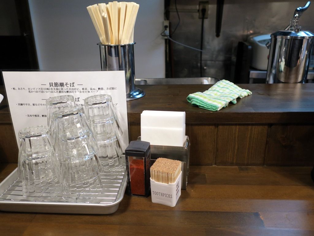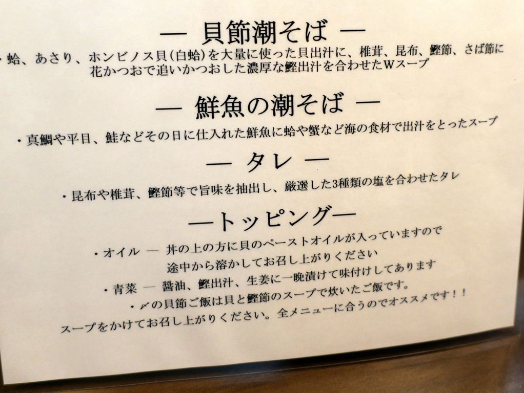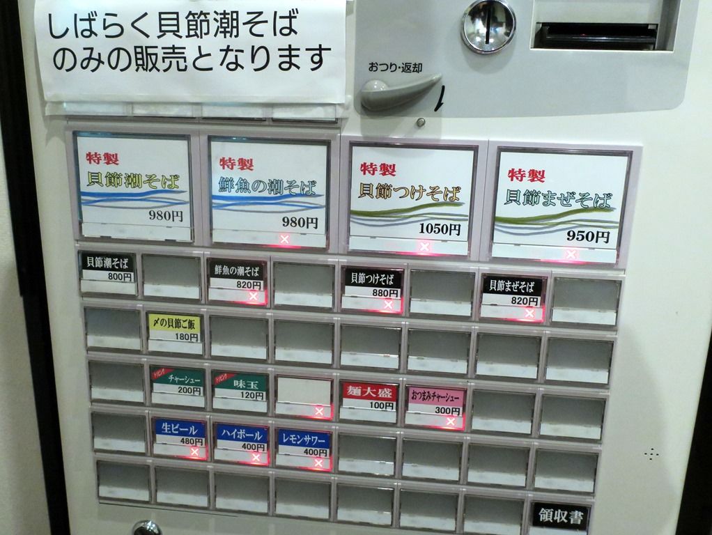 入店すると、まず券売機で食券購入です。主なメニューは、貝節潮そば800円、鮮魚の潮そば820円、貝節つけそば880円、貝節まぜそば820円、〆の貝節ご飯180円、他。しばらくの間麺類は貝節潮そばのみの販売。