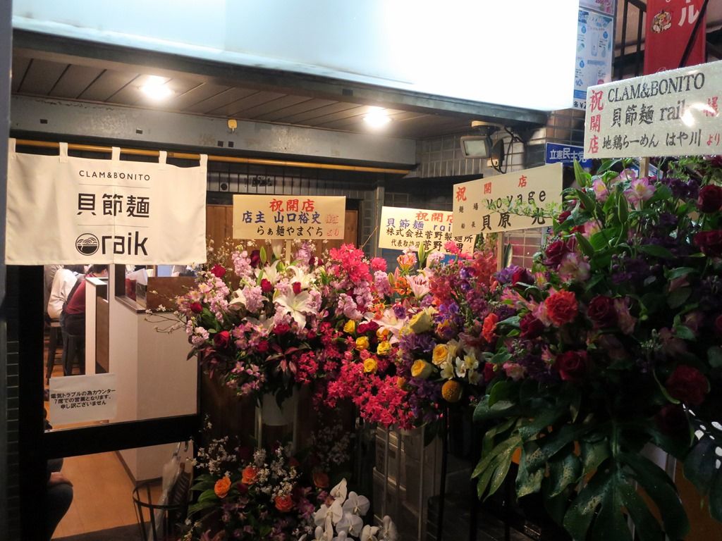 店頭には開店祝花いっぱい。らぁ麺やまぐち、菅野製麺所、viyage、はや川からの花がありました。
