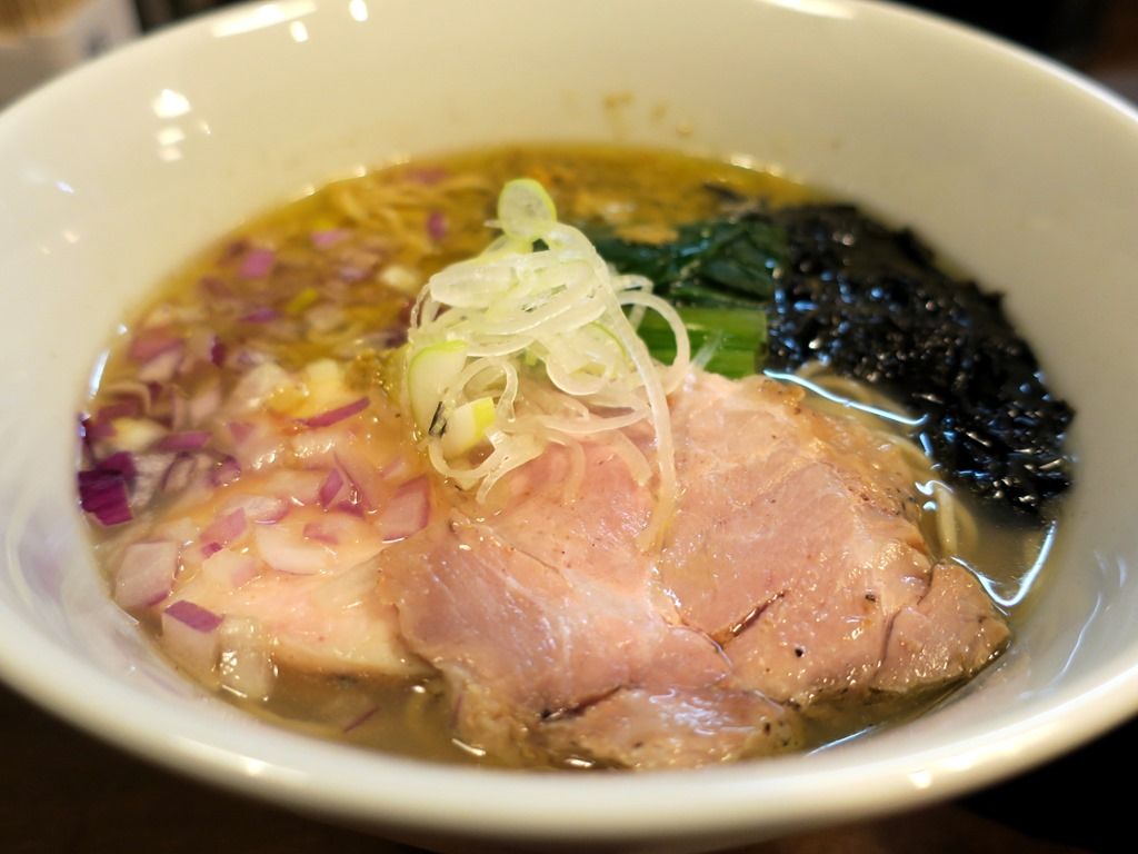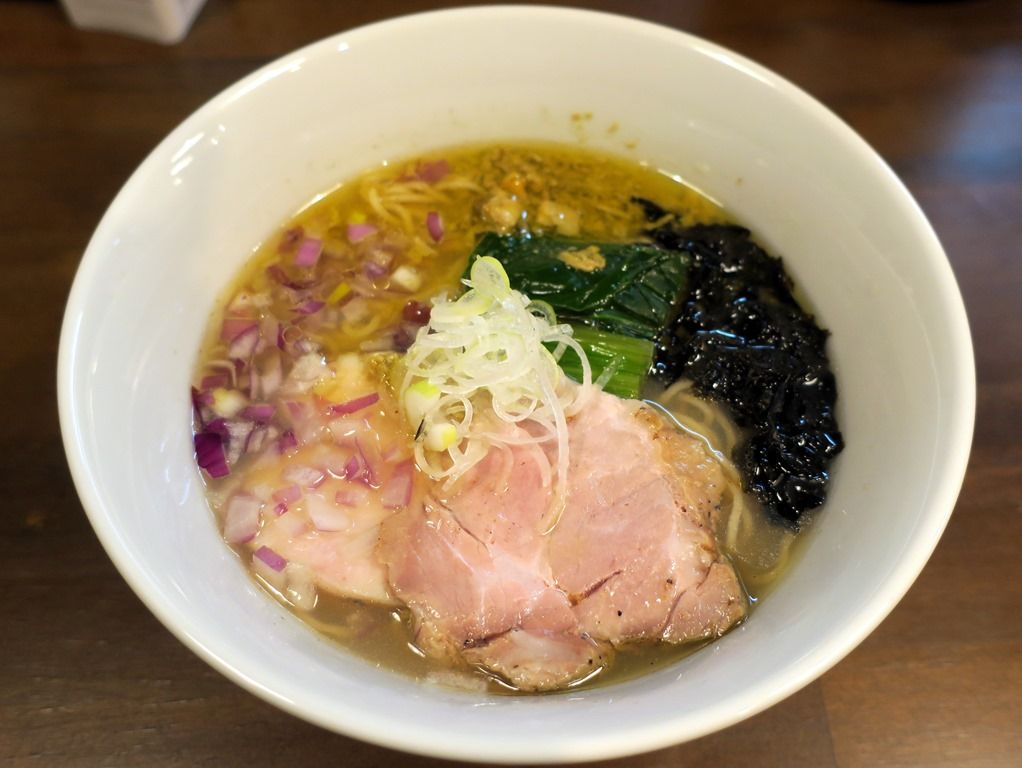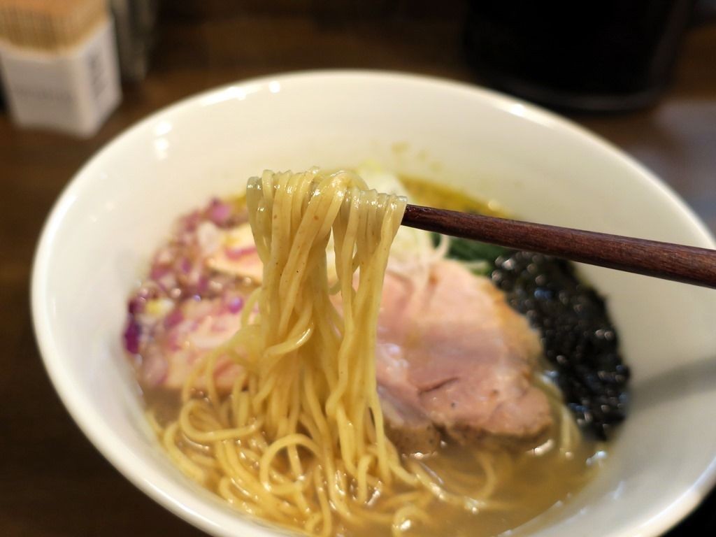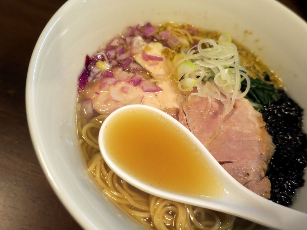 スープはさらさらの清湯塩味。蘊蓄によると、蛤、あさり、ホンビノス貝の出汁に、椎茸、昆布、鰹節、さば節に追い鰹した鰹出汁のWスープ。タレは昆布、椎茸、鰹節に3種類の塩による塩だれ。