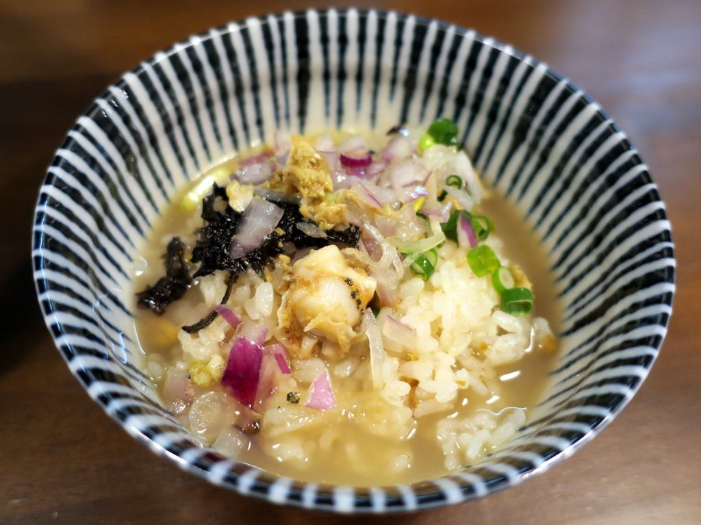 〆は 「〆の貝節ご飯」。ご飯は貝と鰹節のスープで炊いたもの。具はベビーホタテの身、岩海苔、きざみ青ねぎ。