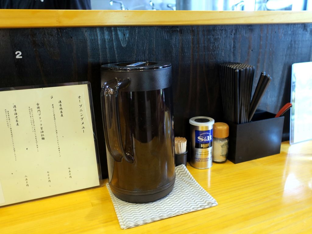 BGMはポップス。箸は洗い箸でエコ仕様。卓上調味料は白胡椒、GABANブラックペッパー。