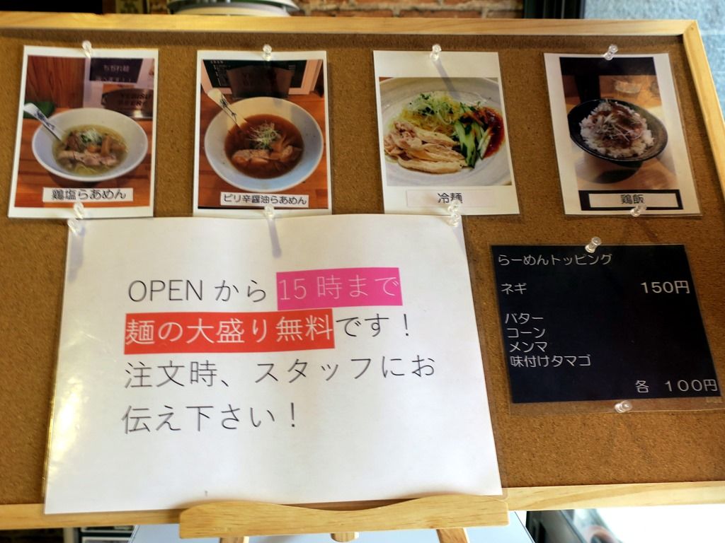 主なメニューは、鶏塩らあめん(並)800円、ピリ辛醤油らあめん(並)950円、鶏塩らあめんセット(並)1050円、ピリ辛醤油らあめんセット(並)1200円、冷麺(並)850円、他。