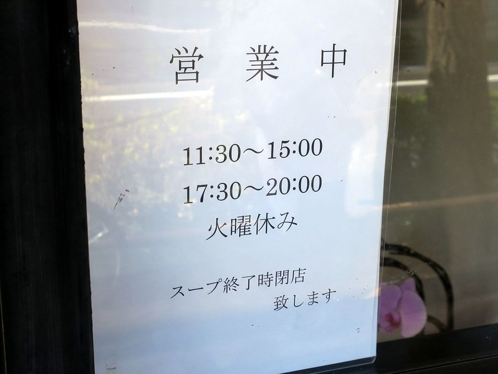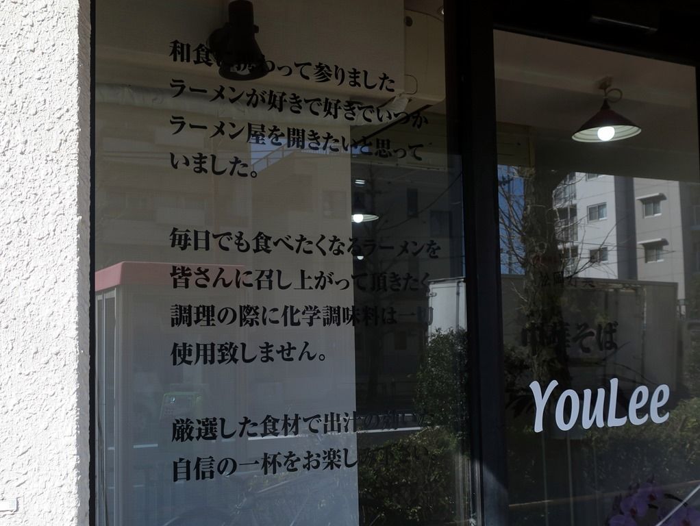 店頭ガラス窓には、「和食に携わって参りました。ラーメンが好きで好きでいつかラーメン屋を開きたいと思っていました。」との自己紹介文。