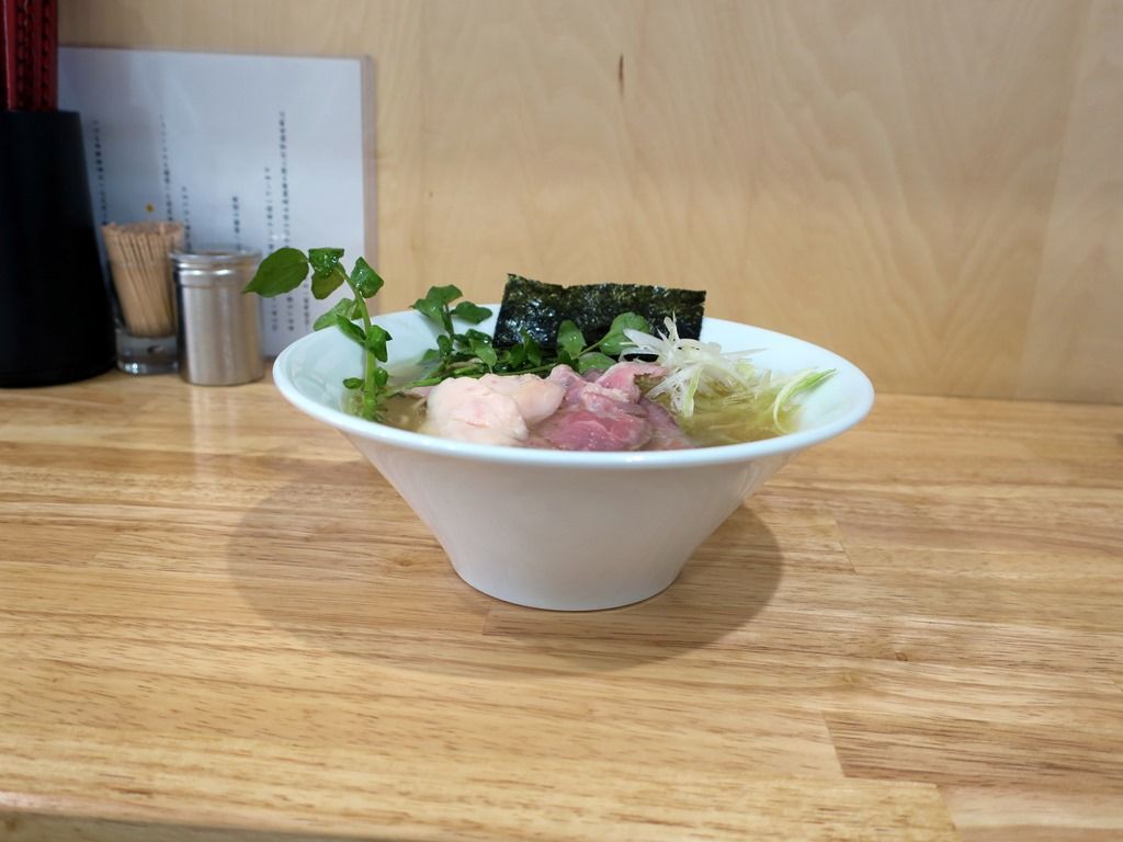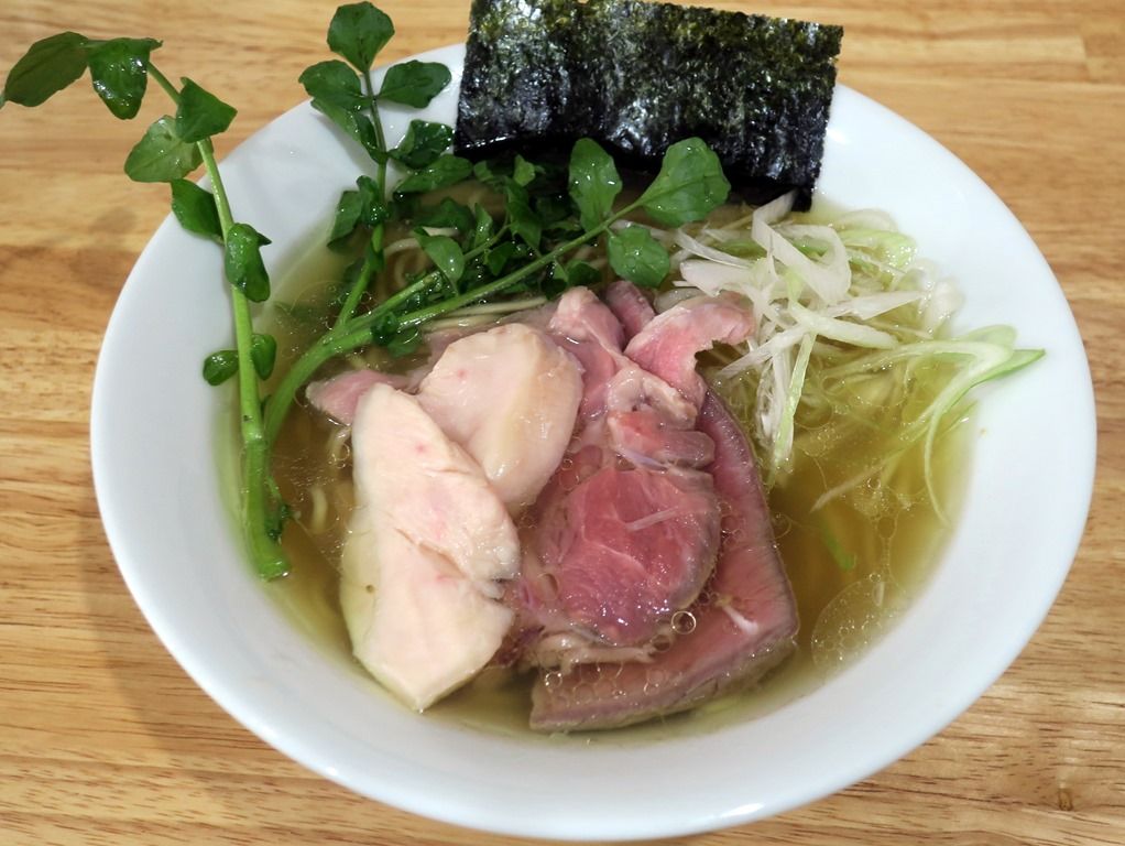 具では特製かと見紛うほどの分厚いカットの牛・豚・鶏のトリプルチャーシューが圧巻。味も超絶美味。ただ、厚すぎて牛の一部は噛み切れず。クレソンも茎の一部が固くて噛み切れず。ナイフとフォークが欲しくなるカッティングで、要一考かと。