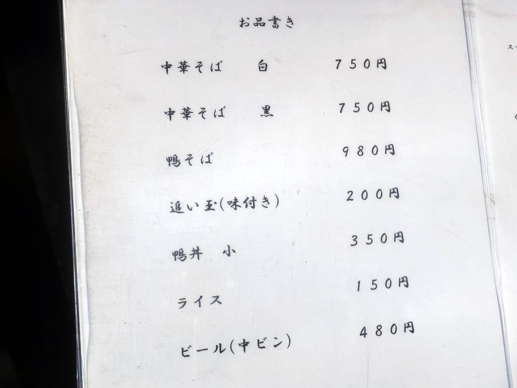 入店すると、まず券売機で食券購入です。主なメニューは、中華そば白750円、中華そば黒750円、鴨そば醤油980円、他。