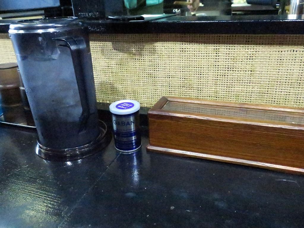 BGMはJ-Pop。B'zしばりでしょうか?箸は割り箸。卓上調味料はGABANブラックペッパー。