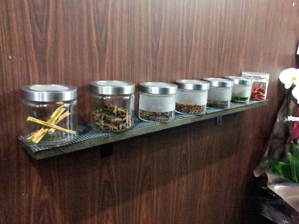 厨房には店主さん、ホール担当の男性のツーオペ体制。壁面には担々麺で使用している香辛料の瓶詰がディスプレイ。