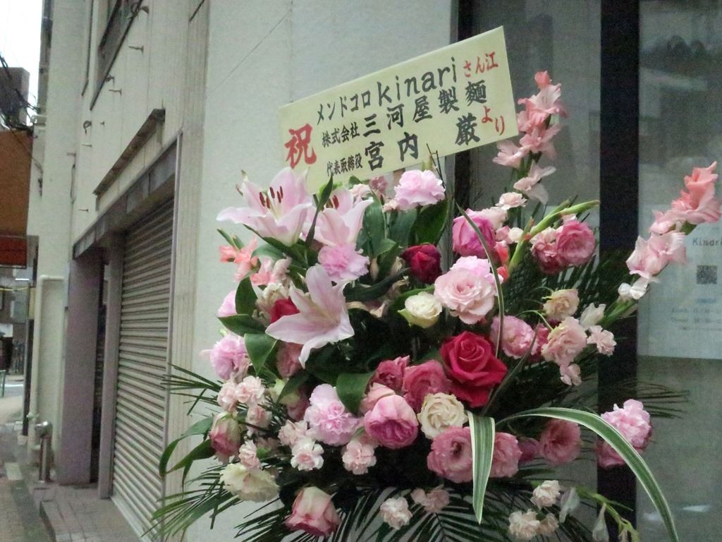 定刻30分前到着で、先客3に接続。店頭には三河屋製麺からの開店祝花。