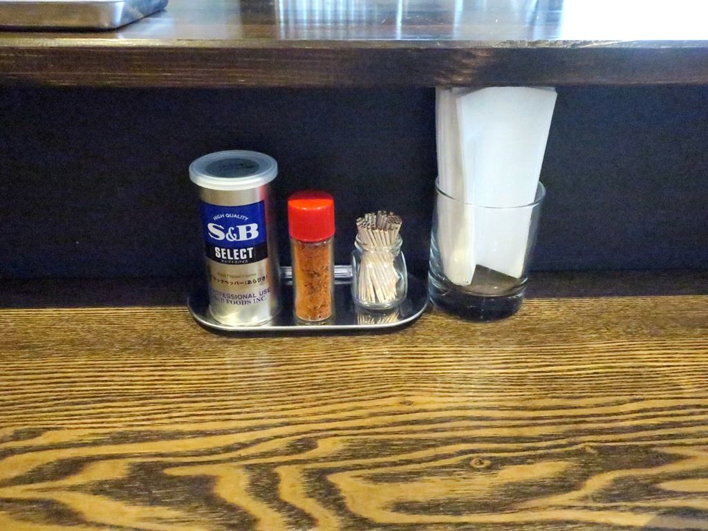 BGMはポップス。箸は洗い箸でエコ仕様。卓上調味料はS&Bブラックペッパー、七味唐辛子。