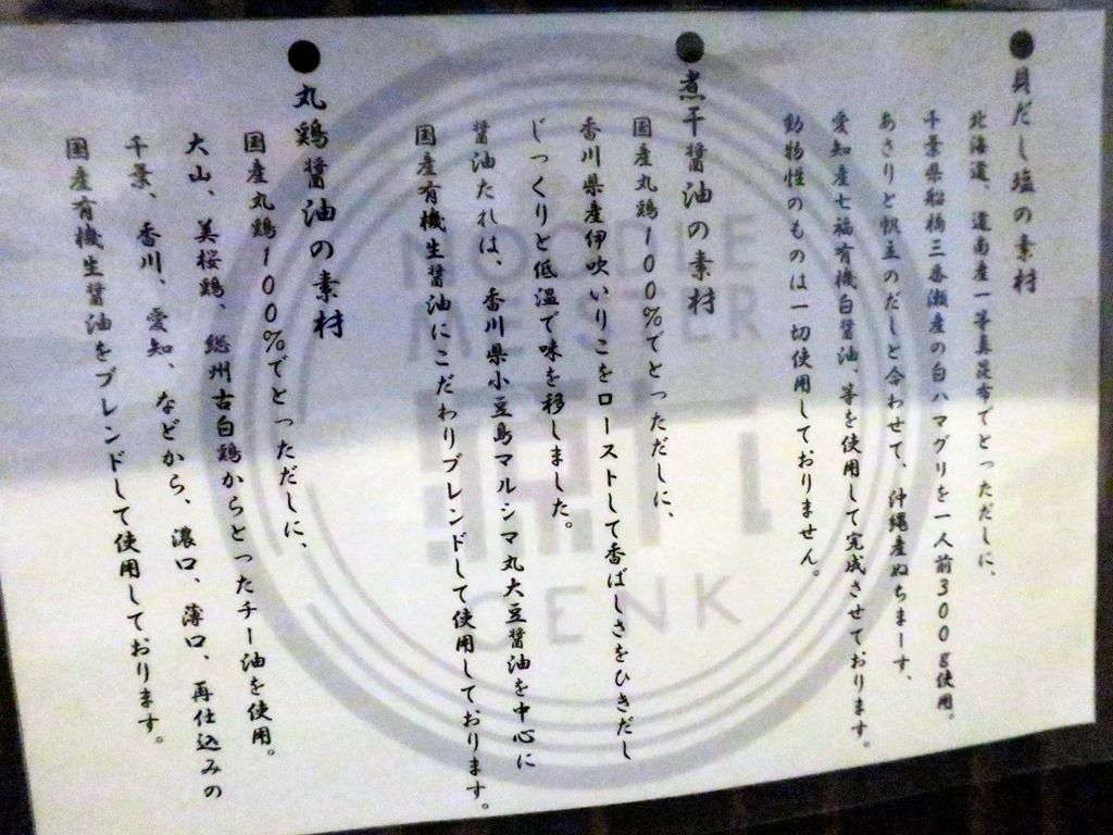 自家製麺、タズミの卵使用、無添加、無化調。