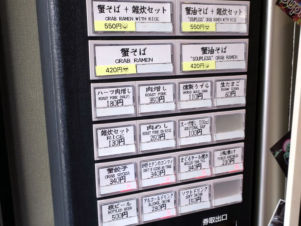 入店すると、まず券売機で食券購入です。主なメニューは、蟹そば820円、蟹油そば820円、雑炊セット130円、肉めし150円、スープ増し100cc100円、蟹餃子340円(準備中)、他。