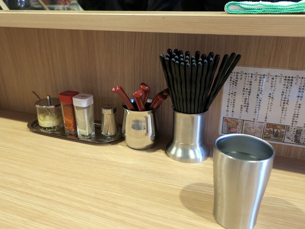 BGMは宇多田ヒカル縛り。箸は割り箸。卓上調味料は、おろしニンニク、一味唐辛子、胡椒。