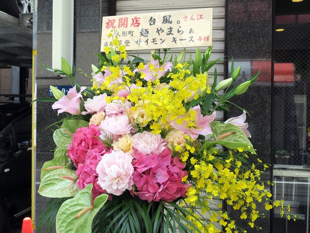 店頭開店祝い花は、近くの麺やまらぁから。定刻1分前、フライングオープン。オープン時約20名の待ち。営業開始後は外待ちのお客さんに小さな紙コップで冷たいお茶のサービスも。