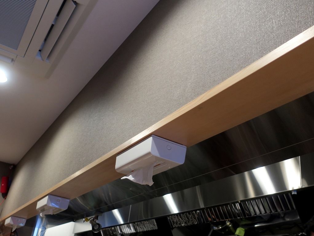 箱テッシュはカウンター上の頭上に。厨房のキッチンタイマーが、ラーメン用は1分40秒。もう一つのタイマーは4分で油そば用?