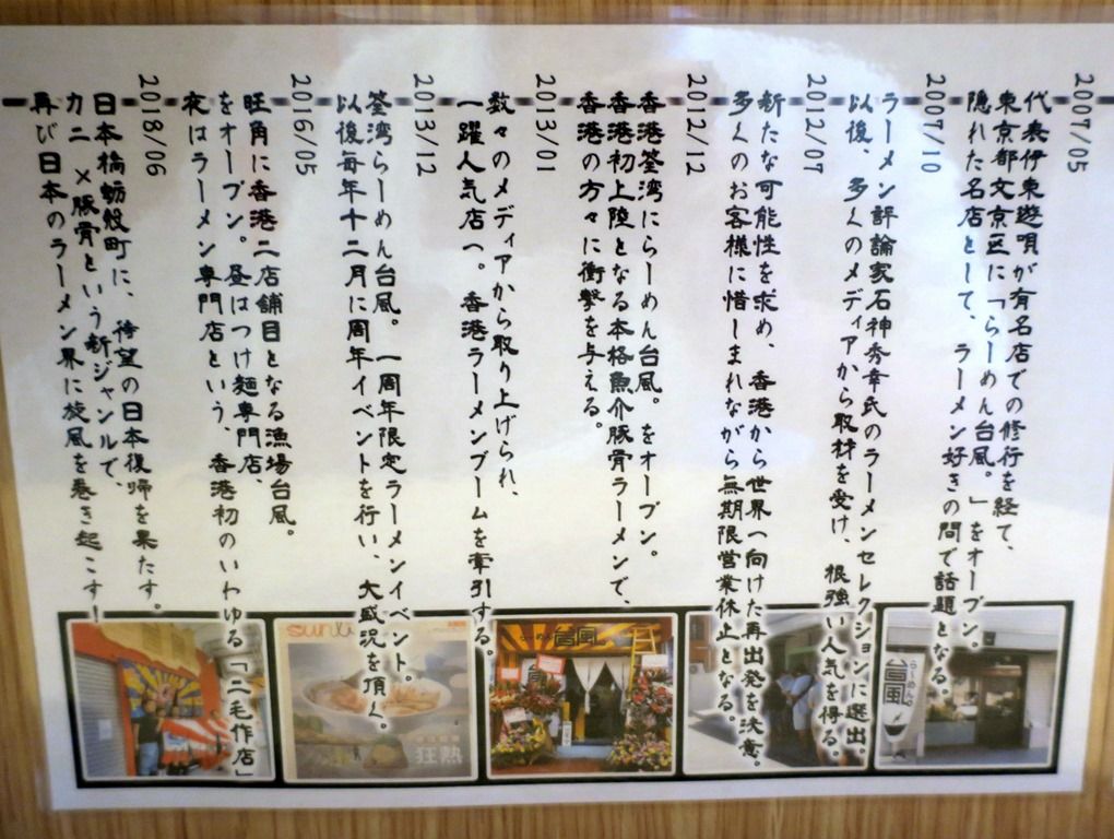 ら〜めん台風は、2007年5月茗荷谷にてオープン。2012年12月香港の荃灣へ移転。2015年4月旺角に漁場台風オープン。2018年6月11日、日本へ凱旋、人形町店グランドオープン。事前に調べてたら、店内カウンターに掲示がありましたw