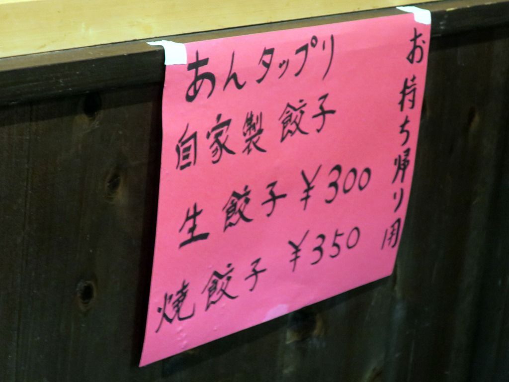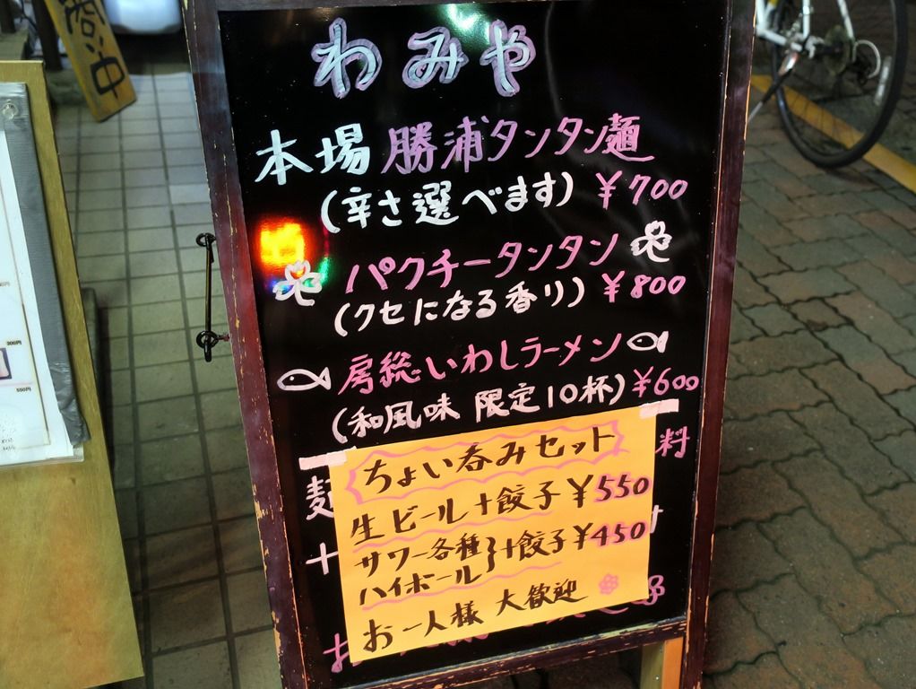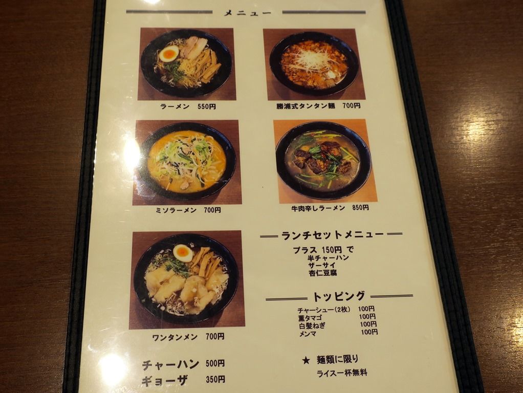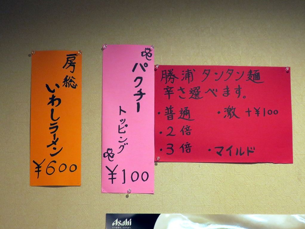 券売機は無く後会計制。主なメニューは、ラーメン550円、勝浦式タンタン麺700円、ミソラーメン700円、牛肉辛しラーメン850円、房総イワシラーメン(限定10食)600円、他。