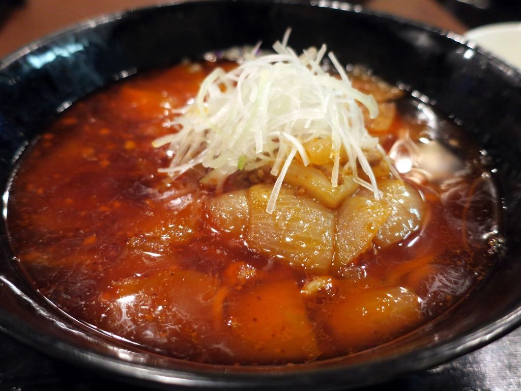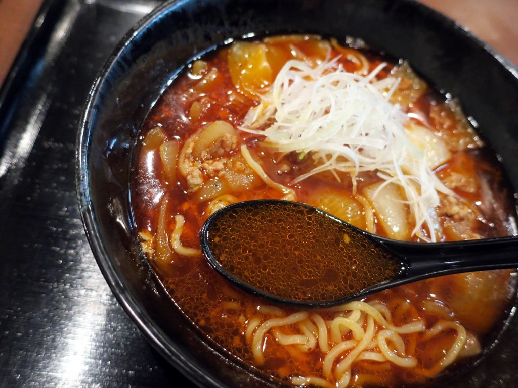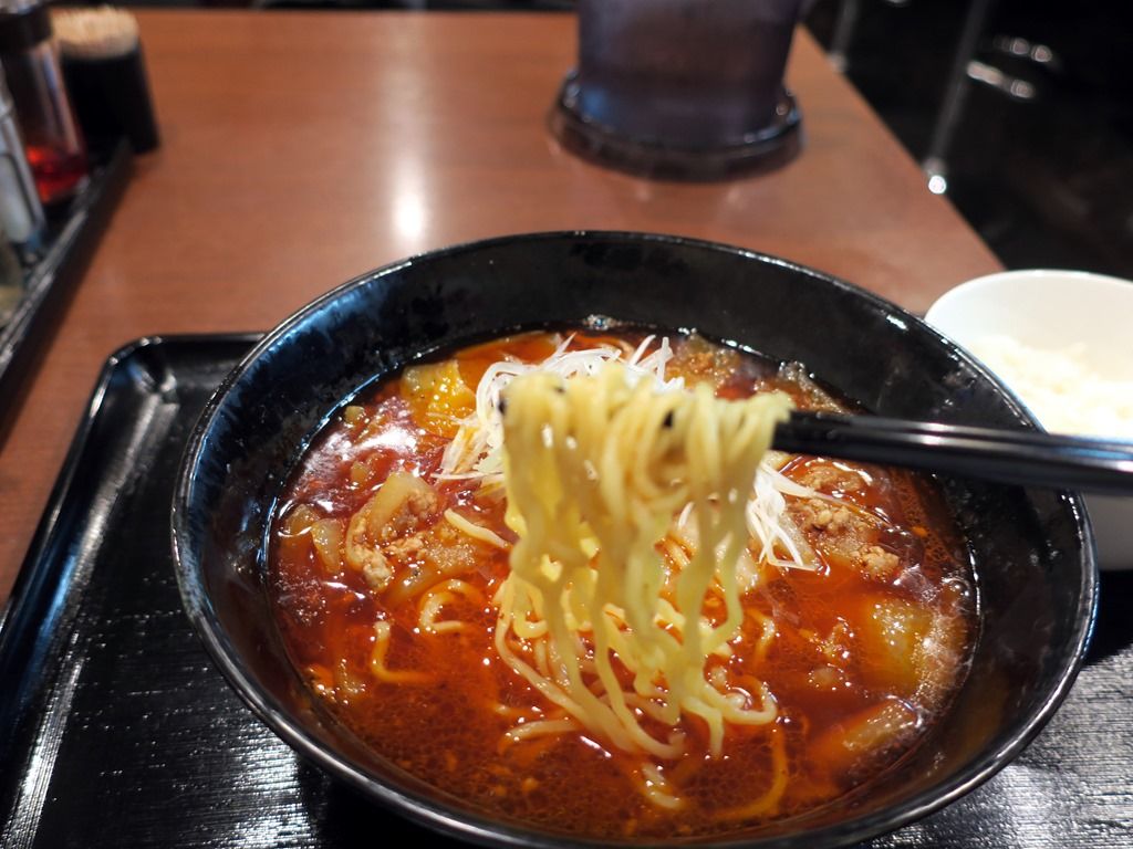 スープはさらさらの清湯ラー油味w炒めた挽肉のコク、大きめカットの加熱された玉ねぎの甘み、ラー油の香ばしい風味が渾然一体に。特に玉ねぎの自然な甘さが、スープに生きています。2倍の辛さは程よいレベルですが、身体の中から火照ってくる感じで、気づくと汗が止まりません(^^;; この勝タンは、思いのほかクオリティ高いですね。美味しい!