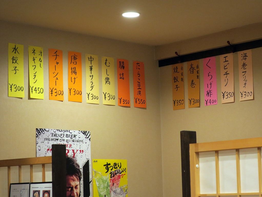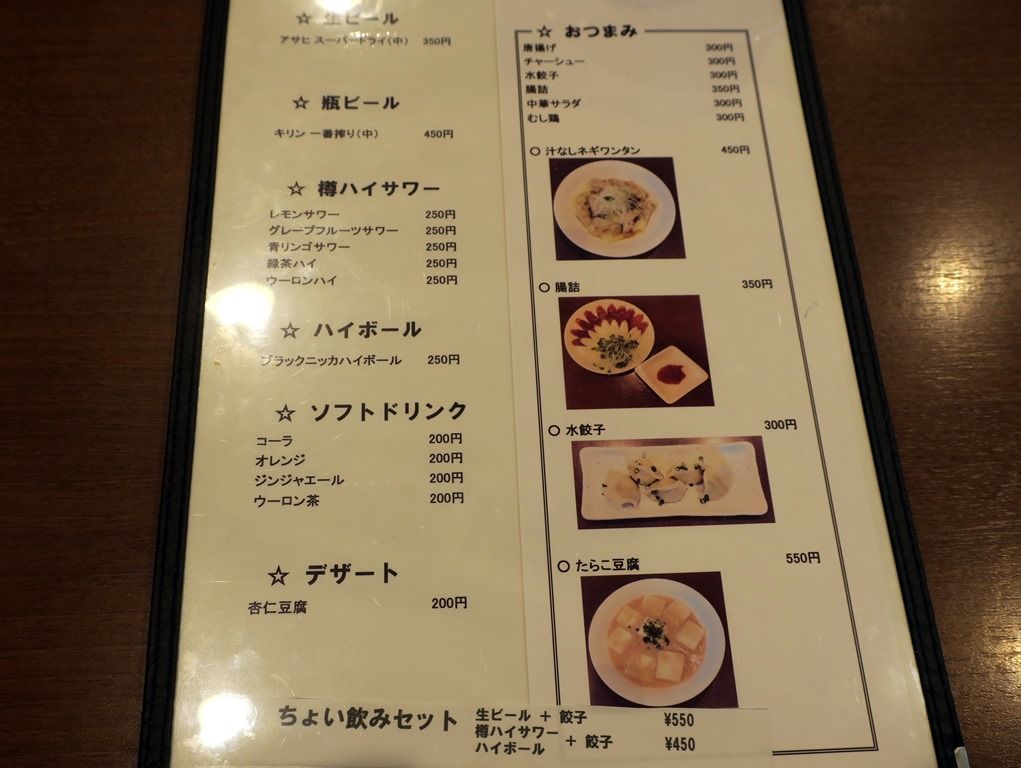 ドリンクはいろいろ。おつまみはそう多くはありませんが、ちょい呑みならOK。テイクアウトは生・焼き餃子。