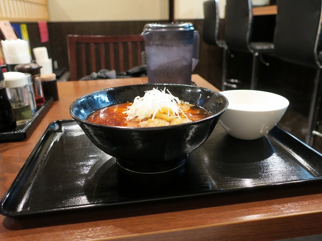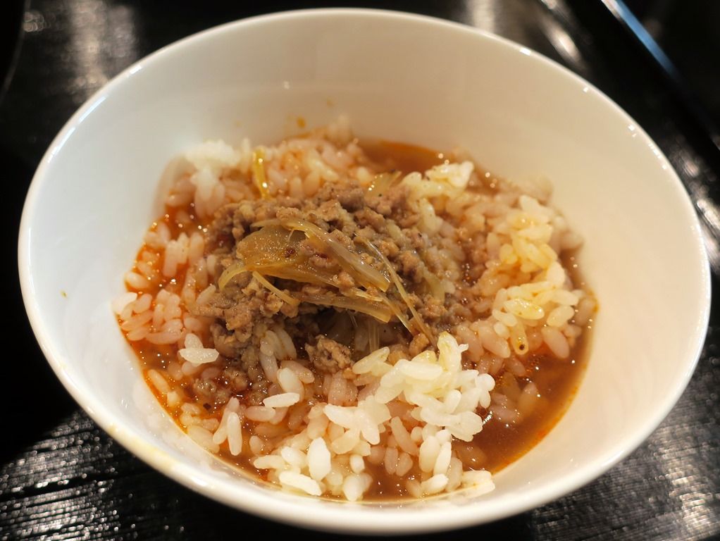 そして待つことしばし、「勝浦式タンタン麺(辛さ2倍)」+サービスライス(少なめ)完成で〜す♪