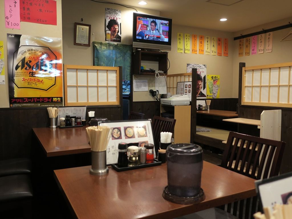 BGMはテレビ放送。箸は割り箸。卓上調味料は醤油、酢、胡椒、ラー油。