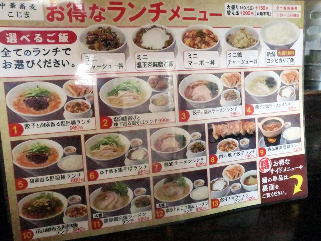 ランチは、7種類の麺と5種類のご飯が選べるセットメニューがお得。選べるご飯は、ミニチャーシュー丼、ミニ温玉肉味噌ご飯、ミニマーボー丼、ミニ鶏チャーシュー丼、新潟コシヒカリご飯(大盛り無料)。