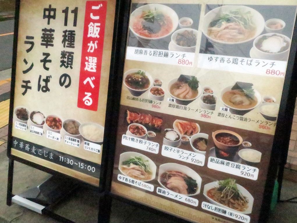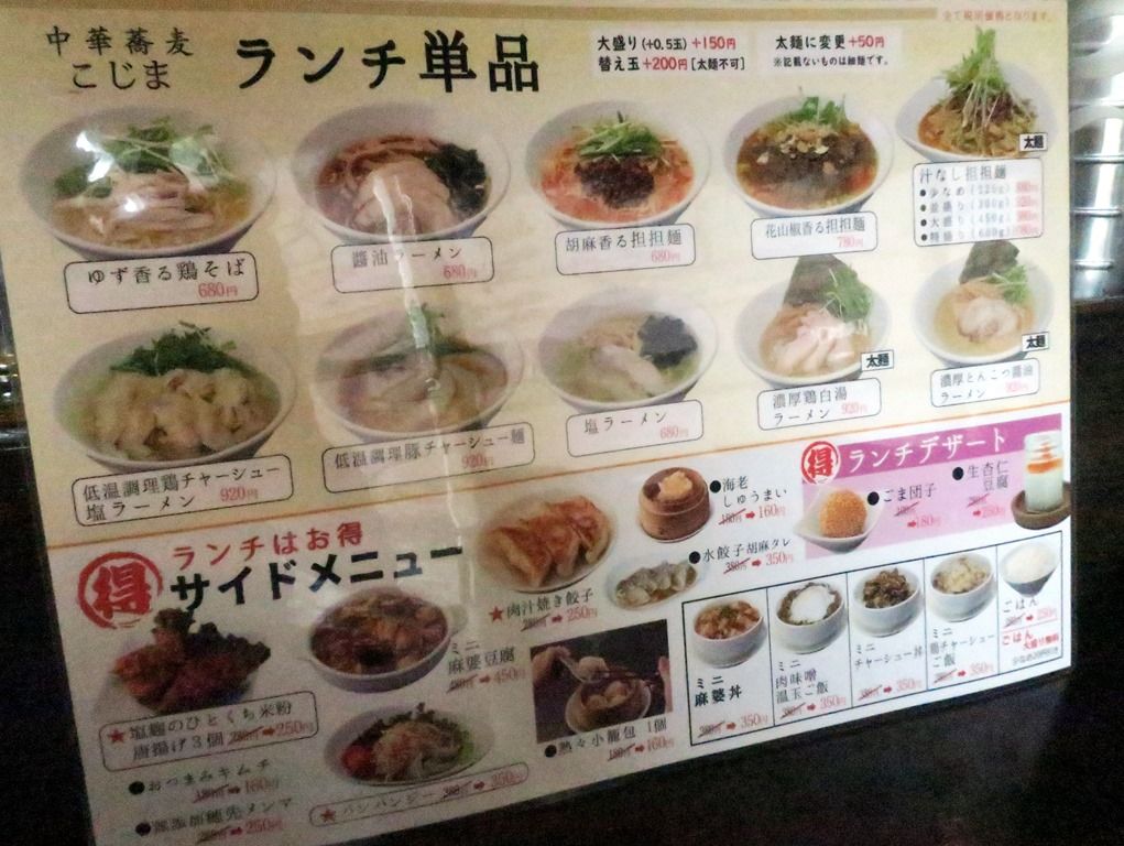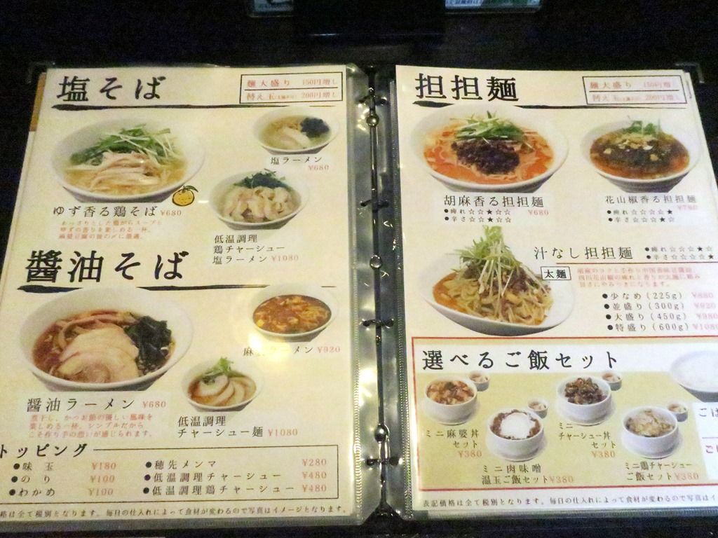 ランチの麺メニューは、ゆず香る鶏そば680円、醤油ラーメン680円、胡麻香る担担麺680円、花山椒香る担担麺780円、汁なし担担麺880円、塩ラーメン680円、濃厚鶏白湯ラーメン980円、濃厚とんこつ醤油ラーメン920円、他。なお、価格は外税表記。