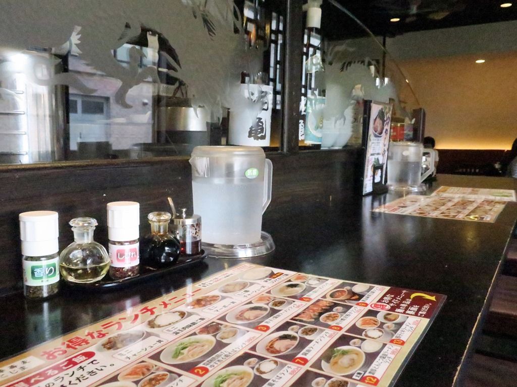 店内はカウンター5席、2人卓x4、4人卓x3。厨房は壁で仕切られた別室ですが、カウンターからは厨房の窓越しに調理の様子が見えます。13:20頃到着で先客6後客14といきなり満席近い盛況に。