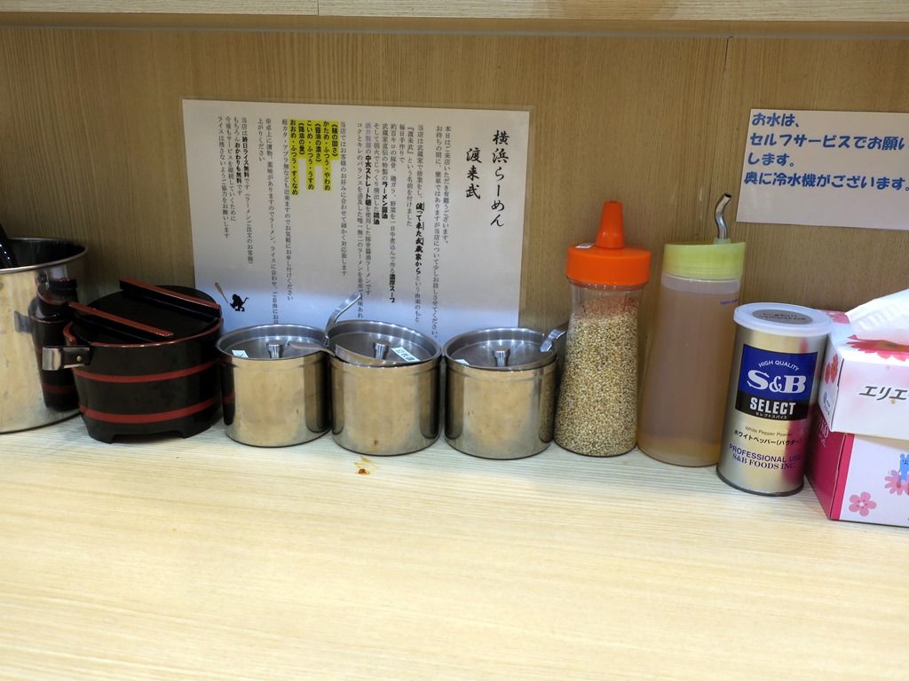 BGMはポップス。箸は割り箸。卓上調味料・薬味は、きゅうりのキューちゃん、おろしニンニク、豆板醤、紅生姜、胡麻、S&Bホワイトペッパー。