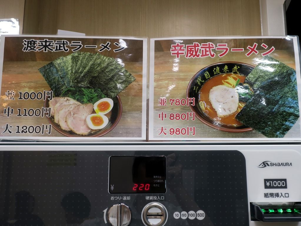 入店すると、まず券売機で食券購入です。主なメニューは、ラーメン680円、中780円、大880円、辛威武ラーメン780円、他。ライス無料、おかわり自由。