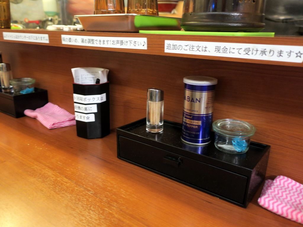 BGMはポップス。箸は割り箸。卓上調味料はGABANホワイトペッパー。