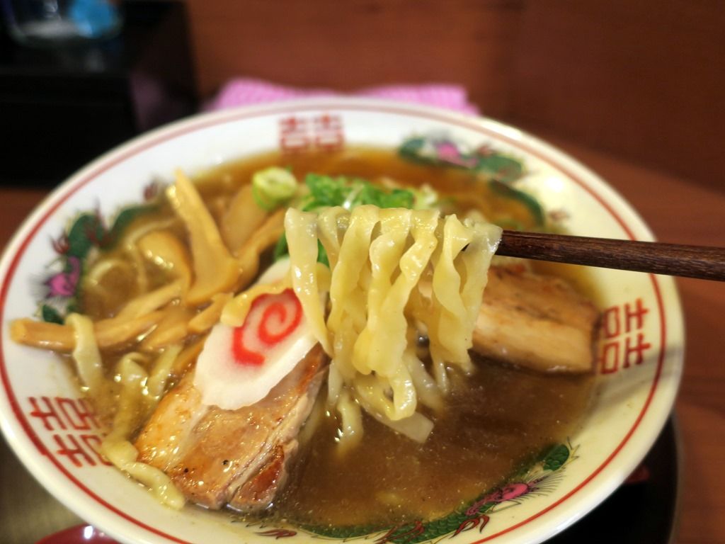 麺は菅野製麺の平打ちで太縮れタイプ。ゆで時間3分15秒と、ゆで上がりまで結構時間がかかります。手揉み風の強い縮れが特徴で、強靭なもちもち感が楽しめます。ただ個人的にはこれでもまだ結構麺固めで、さらに数十秒ゆでた方が、麺の真価が発揮出来そうな気がします。