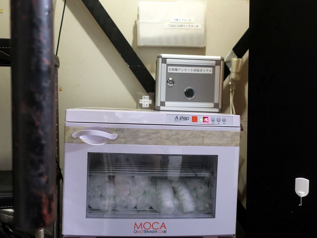 券売機の後ろにおしぼりボックスがあってセルフでどうぞと。その上に紙エプロン。