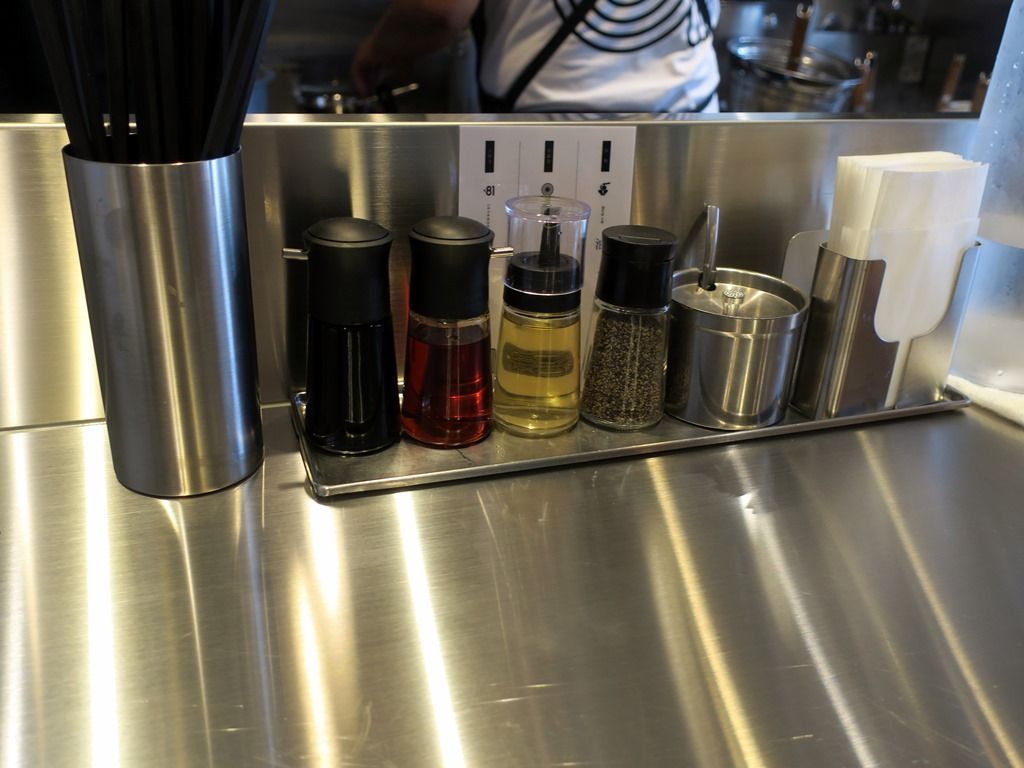 BGMはポップス。箸は洗い箸でエコ仕様。卓上調味料は醤油、ラー油、酢、胡椒、おろしニンニク。