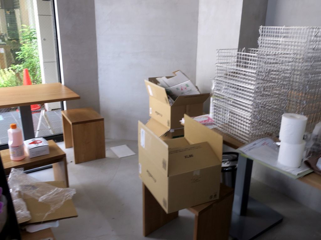 厨房には男性スタッフ2名。出入り口に近いカウンター後ろにおしぼりがあって、セルフで利用可能。紙エプロンの用意あり。