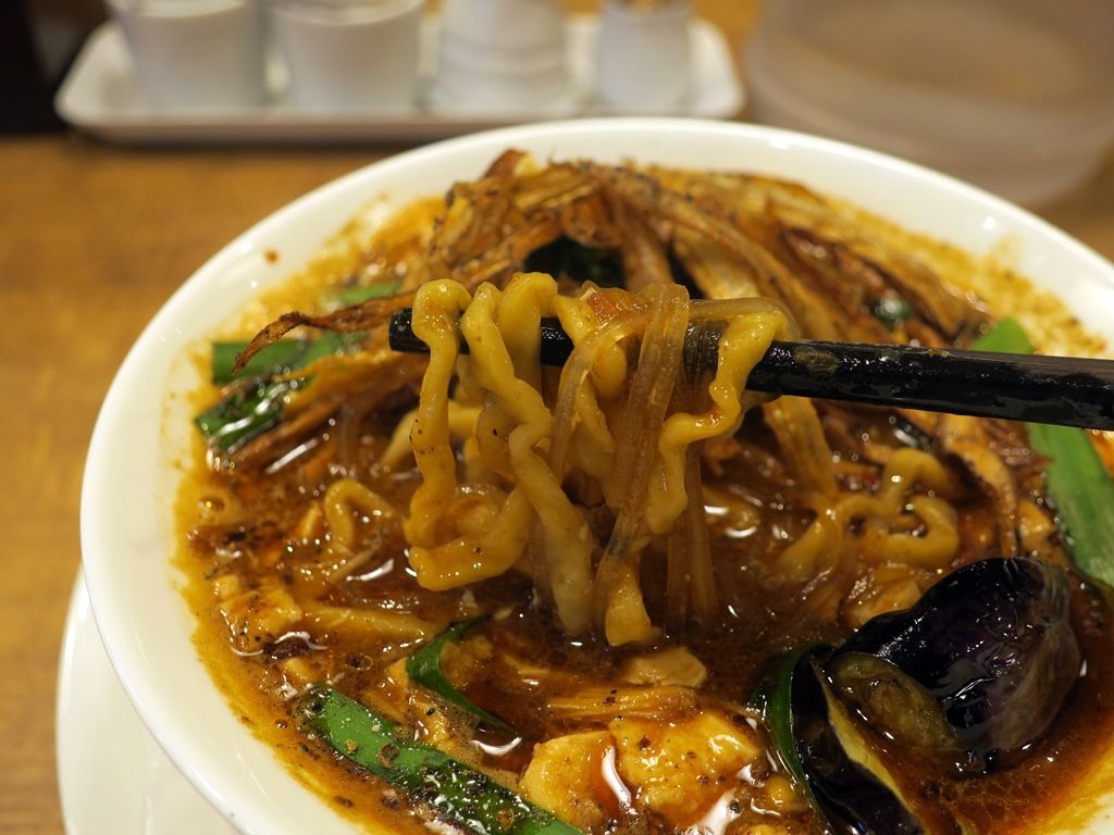 自家製の麺は太縮れタイプ。そしてなんと極細のこんにゃく麺が結構な量入っていて、太麺との食感のコントラストが新鮮。両麺に麻婆スープが絡みまくって、一啜りごとにぶどう山椒の鮮烈な香りと刺激が麺と共に味わえます。
