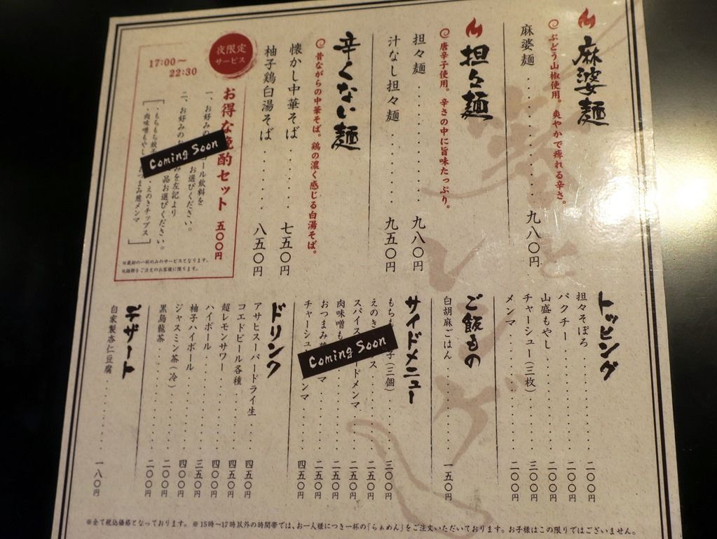 麺メニューは、麻婆麺980円、担々麺980円、汁なし担々麺950円、懐かしの中華そば750円、柚子鶏白湯そば850円。以前と比べてずいぶんシンプルになりました。