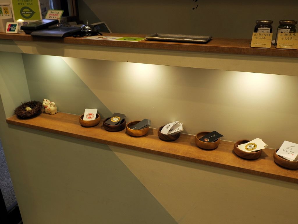 席は真っ直ぐなカウンター5席、可動式の2人卓x10。14:10頃到着で先客8、後客8。スタッフは厨房・ホールに男女合わせて5名。