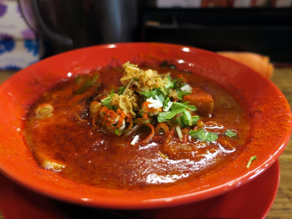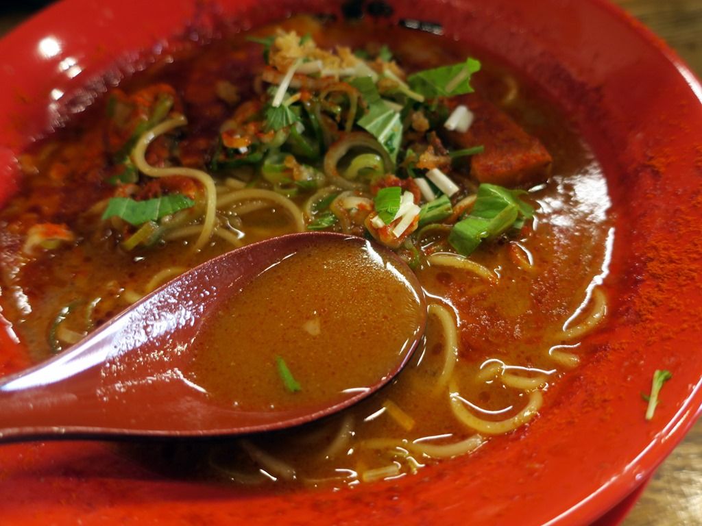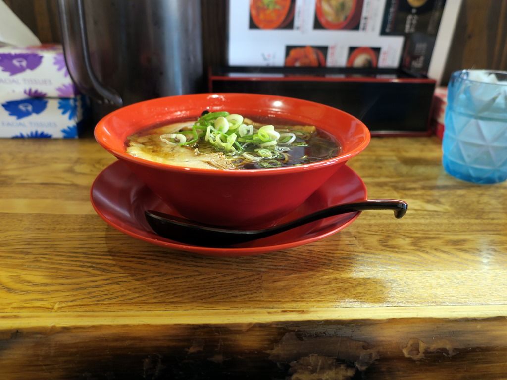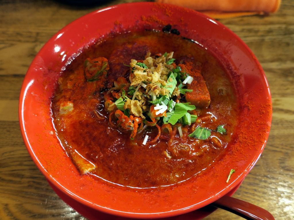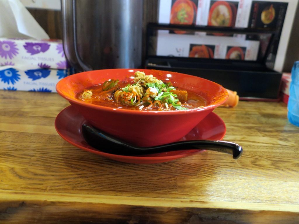 受皿も丼も麺相も、フェラーリレッドの様な真っ赤なビジュアルで着丼。