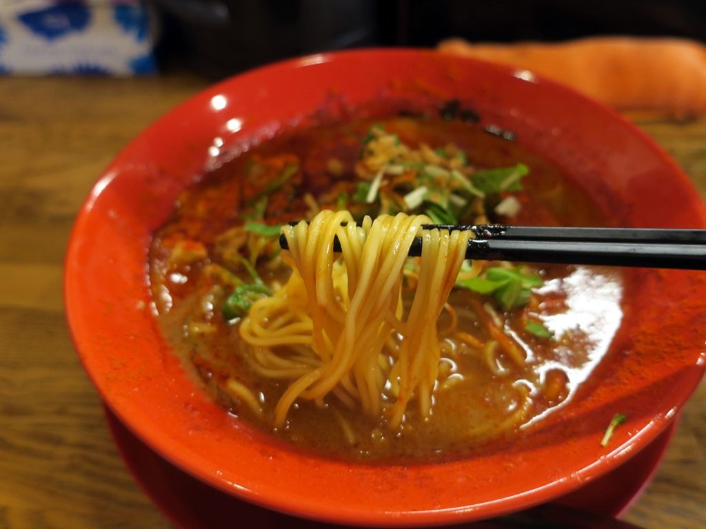 スープはとろ~りとクリーミーな鶏白湯。上からたっぷりと唐辛子粉。ですが、公式サイトで語られているように、唐辛子の風味がして汗が吹き出してくるものの、不思議と辛くない高級唐辛子を使用。辛いものが苦手な店主が完食出来て楽しめる唐辛子を使用とか。香りは良いですが、正直辛いもの好きには物足りません。そして後半鶏白湯スープの甘さが目立ってくるのが辛党的には惜しい点。卓上に辛味調味料が欲しくなっちゃいます。