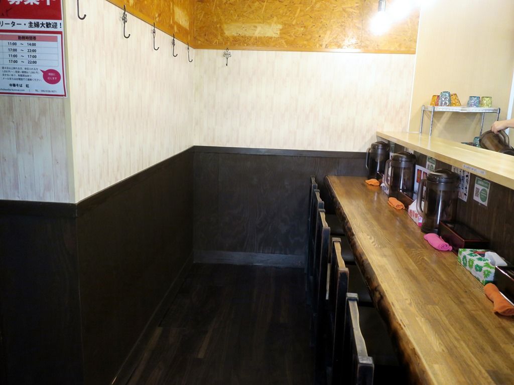 コインパーキング利用で替玉1回無料サービス。店内は厨房前に真っ直ぐなカウンター6席、小上がりに6人卓x1。小上がりは家族連れ向けで要予約。